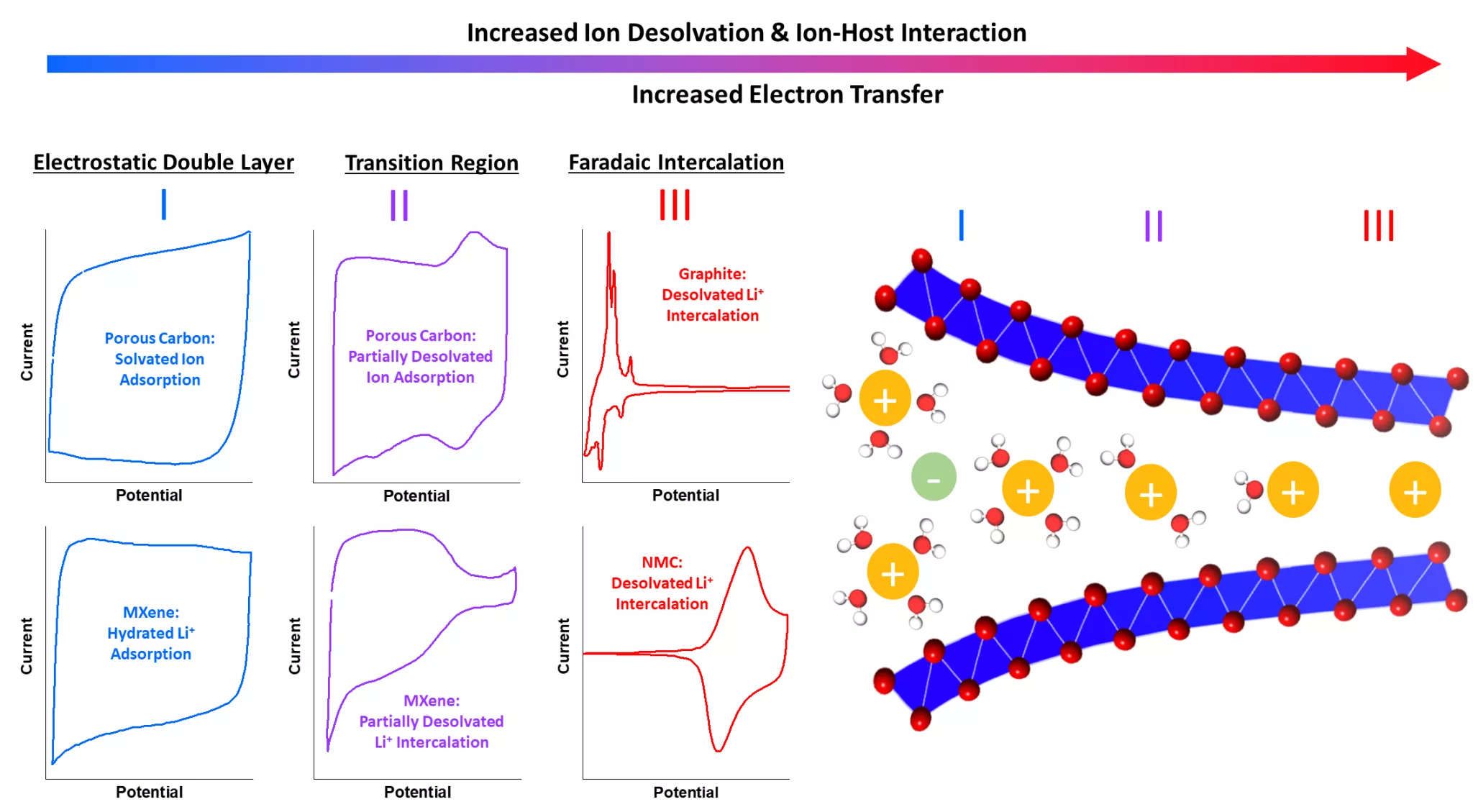 The two charge storage mechanisms have been strictly separated for decades, but in a recent publication in “Nature Energy”, researchers now suggest that there can be a continuous transition between them. In porous and layered electrode materials, ions can be adsorbed while only being partially solvated, depending on the size and geometry of the pore or the interlayer space. The researchers suggest that in this so-called nanoconfinement region, charge storage processes can lie on a spectrum between classic electric double-layer formation and battery-like redox reactions, depending on the level of ion solvation. In this nanoconfinement region, so-called pseudocapacitive charge storage processes can be observed.