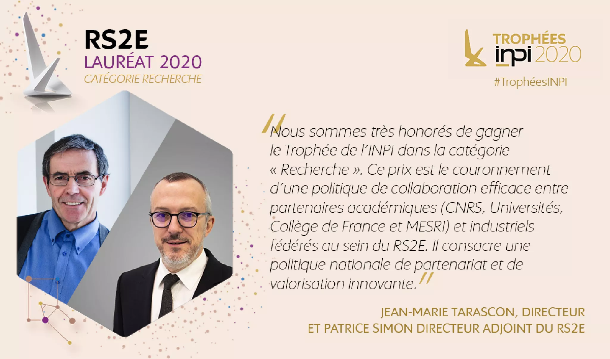 Le RS2E a été distingué lauréat des Trophées INPI 2020 dans la catégorie Recherche, une reconnaissance pour la stratégie de valorisation et de politique industrielle du réseau.